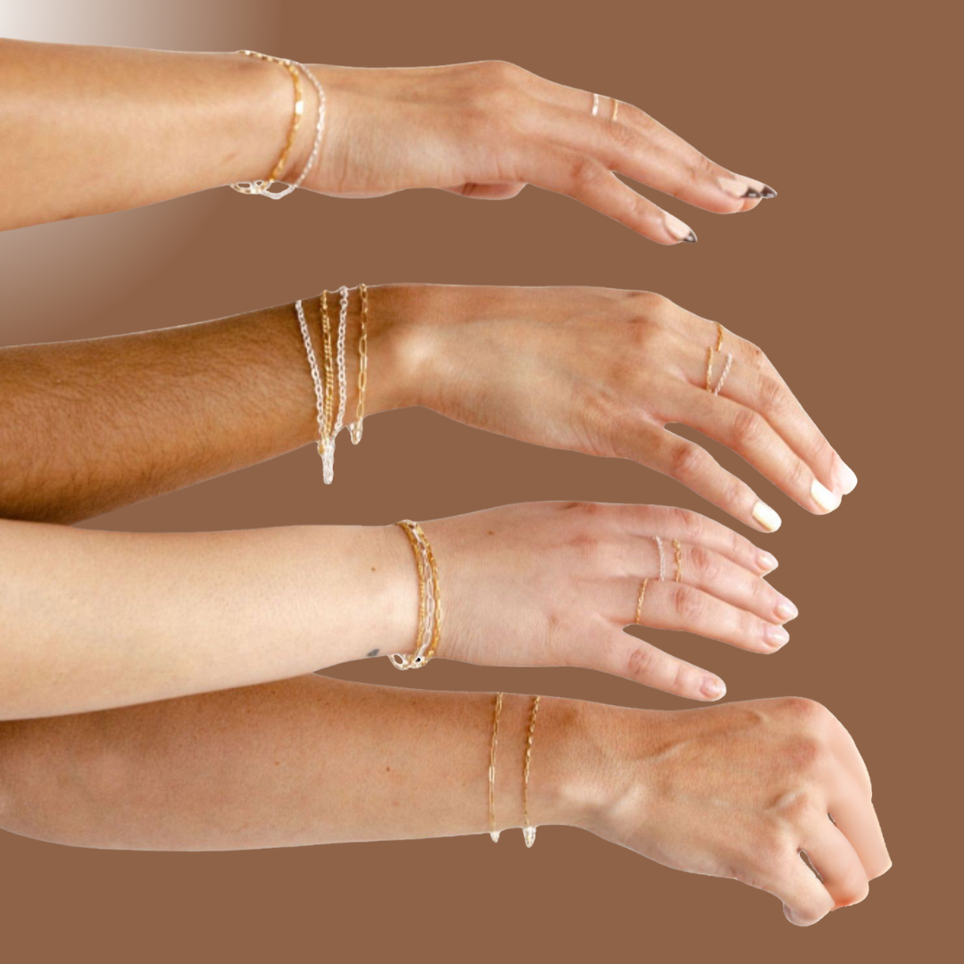 Create your dream piece with us! Choose from 14k gold-filled or sterling silver chains and customize into a necklace, bracelet, or anklet. Add a personal touch with charms and decorative connectors to make it truly unique. You'll have full control over the design, ensuring a one-of-a-kind experience.