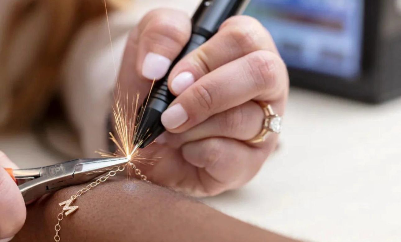 It’s a trending style where bracelets, necklaces, or anklets are expertly welded onto you, creating a seamless, clasp-free design. Don’t worry – the process is pain-free and totally safe!